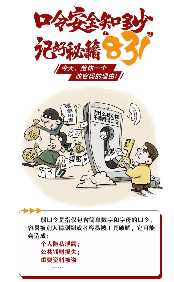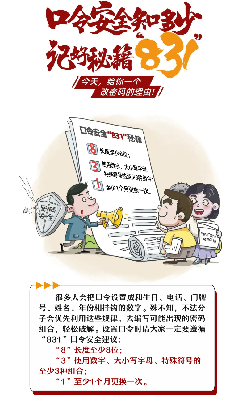 社交媒体、购物网站、视频软件……每天我们都在和众多账号打交道,口令设置,估计没人不会,有人认为设置后就可以高枕无忧了,但是你设置的口令真的安全吗?8月31日,重庆市委网信办提醒各位网民:牢记“831口令安全”建议,保障个人信息、数字财产安全。